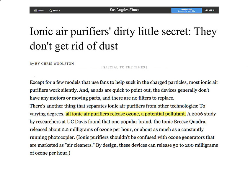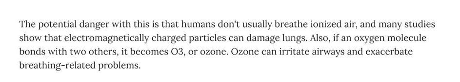 همچنین یون های تولید شده در هوا علاوه بر ریزذرات هوا به اکسیژن موجود در هوا نیز می چسبند و باعث به وجود آمدن ازن می شوند که این گاز، گازی کاملا سمی و مضر برای سلامتی می باشد وموجب تشدید مشکلات تنفسی خواهد شد که در قسمت گاز ازن به طور مفصل در مورد آن توضیح خواهیم داد.